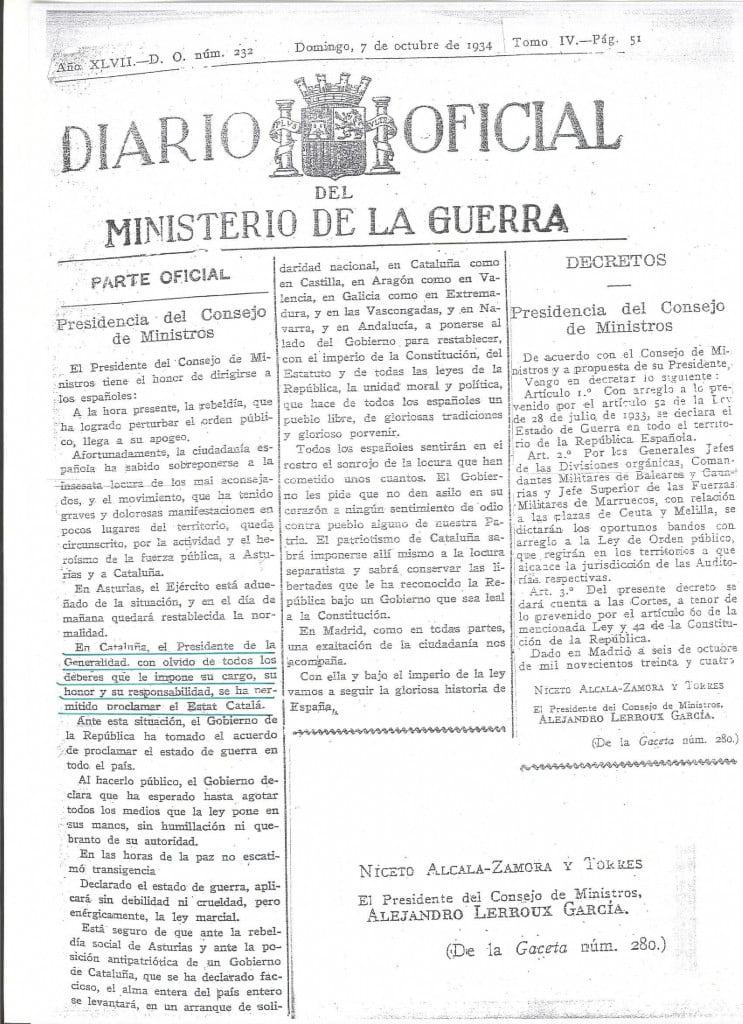 Y para terminar, y simplemente con algo anecdótico, os dejo el Diario Oficial del Ministerio de la Guerra del 7 de octubre de 1934, un día después de que Lluís Companys, presidente de la Generalitat, se asomase al balcón de la plaza de Sant Jaume y gritase: