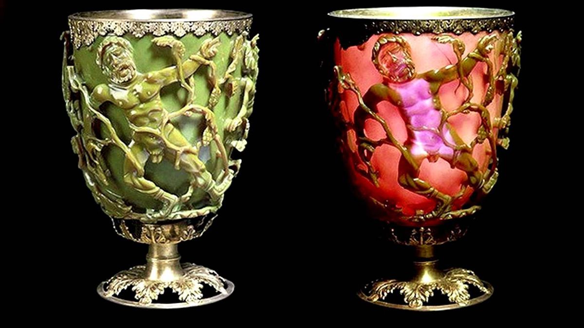Para explicar este misterio tenemos que descubrirnos ante los artistas/científicos del siglo IV porque utilizaron la nanotecnología, sin saber lo que era, para conseguir ese efecto. Analizada su composición al microscopio se encontró sosa, cal y sílice -lo normal-, pero también nanopartículas de plata y de oro de unos 50 namómetros -un nanómetro equivale a una mil millonésima parte de un metro-. La interacción con la luz produce diferentes colores dependiendo de la composición, tamaño y forma de las nanopartículas: el color verde se debe a las de plata y el rojo a las de oro. Entonces, ¿cambiaría también el color dependiendo del líquido que se echase en su interior? Como el Museo Británico, custodio del Grial nanotecnológico, no permite experimentar con líquidos dentro de la copa, los investigadores crearon una pequeña copa con la composición exacta de la original y el resultado fue que, como ellos pensaban, también cambiaba la tonalidad de los colores dependiendo del líquido usado: verde claro para el agua y rojo para el aceite.