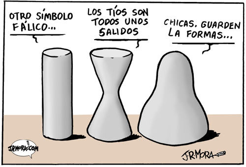 Según un estudio de 2008 encargado por el Ministerio de Sanidad y Consumo -a raíz, según el propio Ministerio (¿?), de los problemas que tenían las mujeres para encontrar tallas de ropa que se ajustaran a sus medidas-, se concluyó que el sistema de tallaje en vigor, establecido en 1972, había quedado obsoleto, ya que, en la actualidad, en España existían tres morfotipos básicos de mujer: el denominado diábolo, el de campana y el cilindro, con unas proporciones entre la población femenina del 39, 25 y 36%, respectivamente. Respecto al estudio, que no merece más comentarios, me quedaré con la viñeta de JRMora…