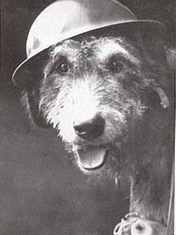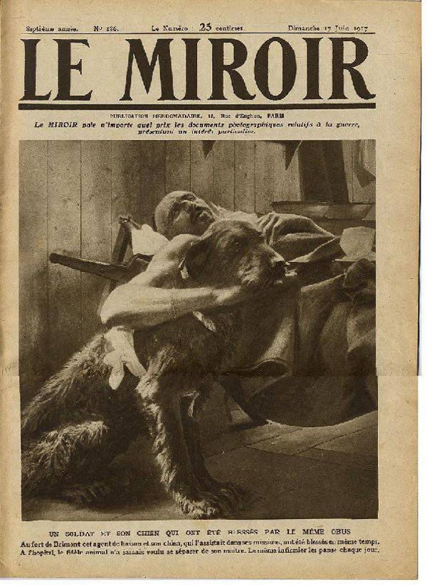 Tras el estallido de la Primera Guerra Mundial, el Irish Guards se desplegó en Francia para luchar en el frente occidental… y con ellos su mascota Bally Shannon. Nada más cruzar el canal de la Mancha, dejó de ser la mascota para convertirse en uno más del regimiento en labores de centinela, transporte y, sobre todo, de auxiliar sanitario. Además de poder llegar rápidamente con el botiquín allí donde se necesitase, Bally, gracias a su tamaño y su fuerza, podía arrastrar a los soldados heridos que habían quedado en la tierra de nadie – terreno situado entre las trincheras- y ponerlos a salvo en la trinchera propia. Se cuenta que rescató a 10 irlandeses. Lógicamente, entrar en aquel terreno durante la batalla era exponerse a las balas y los obuses alemanes, y nuestro héroe canino fue herido en dos ocasiones. En la segunda de ellas, en abril de 1917 en la localidad francesa de Brimont, un obús estalló cerca de Bally y del sanitario que le acompañaba hiriendo a ambos. La revista francesa Le Miroir publicó la foto de ambos… -«La misma enfermera los trata cada día a los dos»-.