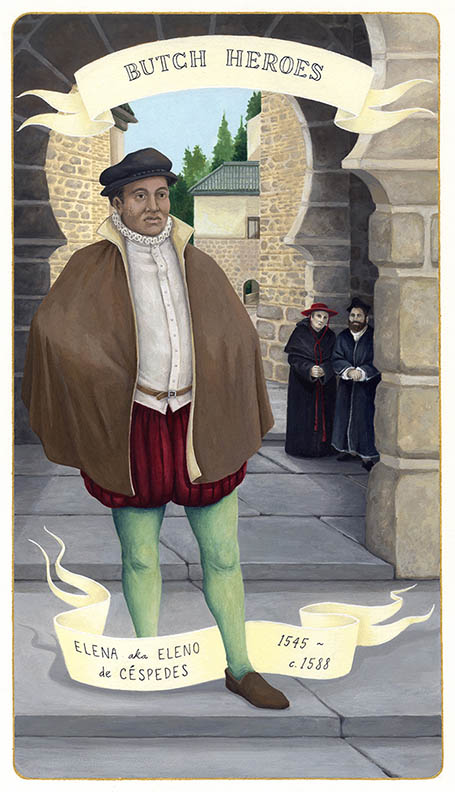 Durante unos años recorrió varios pueblos, ganándose la vida con lo que le salía: tejedora, zurcidora, calcetera… hasta que reaparece en 1568 en las Alpujarras, como soldado del rey enviado para sofocar la rebelión de los moriscos. Lógicamente, aquí ya no era Elena de Céspedes, sino Eleno de Céspedes, el mulato Céspedes o, simplemente, Céspedes. Elena no cambió su apariencia para incorporarse ejército, sino que lo hizo porque se sentía hombre. Era un transexual, un hombre atrapado en el cuerpo de una mujer. Y desde aquel momento, actuó como un hombre. Eso sí, un hombre imberbe y con voz afeminada que levantó muchas sospechas. Derrotados los moriscos, viajó hasta Madrid, recién nombrada capital de España y con muchas oportunidades, donde comenzó a ganarse la vida como sastre, un empleo muy relacionado con sus anteriores trabajos pero más masculino. Y no le fue mal, hasta que se cruzó en su camino un cirujano de la Corte, con el que trabó una gran amistad, que le abrió los ojos de su verdadera vocación: la cirugía. Visto el inusitado interés de Eleno, su nuevo amigo le prestó libros para leer, ejerció de profesor particular e incluso le permitió ayudarle en sus intervenciones. En pocos años, Eleno, aunque sin título, se veía como un cirujano profesional. Sabiendo que allí lo tendría difícil, se trasladó a El Escorial, una incipiente población tras poner Felipe II sus ojos en ella, para ejercer su nuevo oficio. Y las cosas se volverían a torcer: un vecino, que lo conocía de su época en Madrid, lo denunció por ejercer sin título. Sin problema, regresó a Madrid y consiguió el título, convirtiéndose en la primera cirujana de la historia de este país. Bueno, a ojos de todos era un hombre. Sobra decir que, como mujer, habría sido imposible, ya que estamos en una época en la que las mujeres no podían ejercer determinadas profesiones, y ésta era una de ellas.