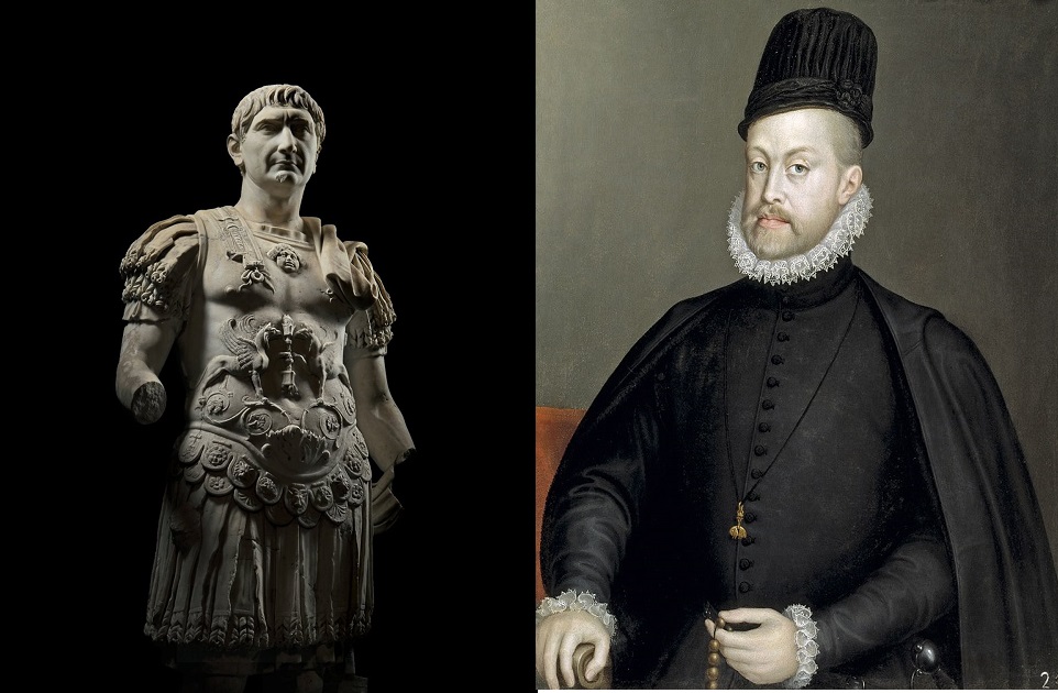 Además de sus orígenes hispanos –Trajano nació en el 53 en Itálica, en el actual término municipal de Santiponce (Sevilla), y Felipe II en Valladolid en 1527- y por ser emperadores en los mayores imperios de su época, tienen algo más en común: aparecen en el himno nacional de un país extranjero. Felipe II en el de los Países Bajos y Trajano en el de Rumanía. Y si ya es sorprendente que sean protagonistas de himnos de países que no son el suyo, todavía lo es más que, en su momento, fueron los que «sometieron» a los pueblos que hoy en día los honran en sus himnos nacionales.