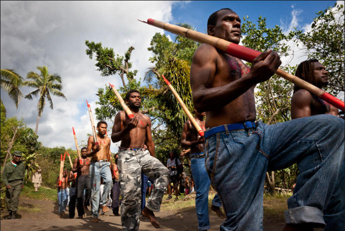 Las Nuevas Hébridas, nombre que recibió el archipiélago de las islas Vanuatu en el Pacífico Sur durante la época colonial, fueron colonizadas por los europeos en el siglo XVIII, pero no fue hasta 1880 cuando Francia y Reino Unido reclamaron regiones del archipiélago. Para solucionar aquel conflicto, en 1906 se firmó un acuerdo de condominio para que cada uno gobernase su parte bajo su propio sistema legal. La colonización conllevó la prohibición de las costumbres y rituales religiosos propios de estas comunidades tribales, y la imposición de los de la civilización europea.