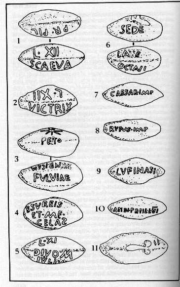 En el 41 a.C, y tras la ofensiva de Octavio, Lucio Antonio se replegó a la ciudad de Perusia (actual Perugia) esperando el regreso de su hermano y las negociaciones de Fulvia con las legiones acantonadas en la Galia… pero nadie llegó en su auxilio. Las tropas de Octavio sitiaron la ciudad y ante la dificultad de tomarla decidió rendirla por hambre. Durante los dos meses que duró el asedio, se produjo una batalla de SMS de época… los honderos -famosos eran los baleares- estuvieron lanzando proyectiles (de piedra o plomo) en los que grababan frases: «pete culum Octaviani» (para el culo de Octavio), «Luci Antoni calve, Fulvia, culum pandite» (Lucio Antonio calvo, Fulvia muéstranos tu culo)… y otras menos jocosas «Esureis et me celas» (aunque lo ocultéis os estáis muriendo de hambre).