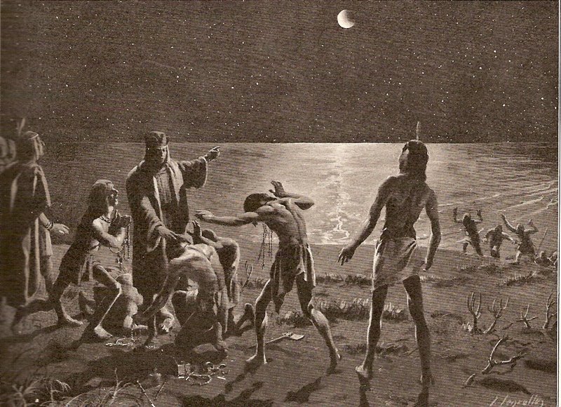 El 3 de abril de 1502, Cristobal Colón iniciaba su cuarto viaje al continente americano. Después de explorar la costa atlántica de Centroamérica y ya de regresó a la isla de La Española, fueron sorprendidos por una tormenta que les obligó a desviarse a Jamaica. En junio de 1503 Colón desembarcaba en la playa de Santa Gloria. Salvaron la vida, pero los cascos de sus dos carabelas estaban seriamente dañados y era imposible volver a echarse a la mar. El almirante ordenó utilizar los restos de las naves para construir un fortín. Una vez terminado, se enviaron expediciones al interior de la isla para contactar con los nativos y poder conseguir víveres mediante el trueque con las habituales baratijas. Así se mantuvieron durante meses con la esperanza de que algún barco español navegase por la zona y los pudiese rescatar, ya que no tenía las herramientas necesarias para construir una embarcación para salir de allí. Las cosas se pusieron tensas en el fortín cuando los nativos se negaron a proporcionar más alimentos si no ofrecían alguna cosa de más valor… los conocimientos astronómicos de Colón les salvarán. Gracias al libro Almanach Perpetuum (1478), del astrónomo sefardita Abraham Zacuto, el almirante sabía que el 29 de febrero de 1504 habría un eclipse total de luna. Ese mismo día, se reunió con los caciques locales y les amenazó: