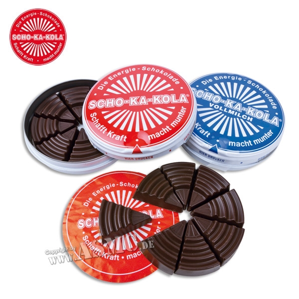 Scho-ka-kola era una marca alemana de chocolates creada en 1935 por el chocolatero berlinés Theodor Hildebrand. Era un chocolate negro de sabor agridulce y en cuya elaboración se utilizaba cacao, café y nuez de cola (el fruto de un árbol tropical del mismo nombre con un elevado contenido en cafeína), y que se comercializaba en tabletas redondas divididas en ochos porciones dentro de una lata roja y blanca. La presentación oficial de Scho-ka-kola se hizo en los Juegos Olímpicos de 1936 en Berlín como un producto que aportaba energía a los deportistas.