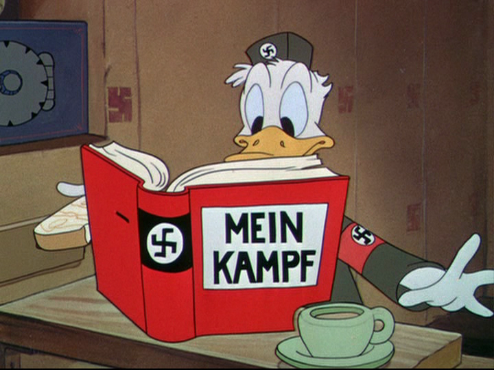 Si importante era la financiación, también lo fue la propaganda para hacer ver a la sociedad estadounidense a qué se enfrentaban y, de esta forma, vender la necesidad del reclutamiento masivo. Y aquí es donde Disney puso su granito de arena produciendo varios cortos de animación como Education For Death, la historia de un niño alemán llamado Hans al que el régimen nazi educa para convertirlo en un fanático; Los Tres Cerditos, en una versión donde el lobo feroz, con gorra nazi y un brazalete con la esvástica, es incapaz de derribar la casa de los cerditos construida con bonos; o Der Fuehrer’s Face (originalmente titulada Donald Duck in Nutzi Land), en el que el Pato Donald era un trabajador de una fábrica de armamento en Alemania, sometido al fanatismo y la propaganda nazi en todo momento, que termina despertando de aquella pesadilla con su pijama tipo «Barras y Estrellas» y se abraza a una figura de la Estatua de la Libertad.