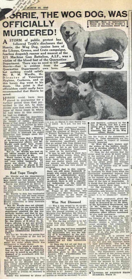 En 1945, el escritor australiano Ion Idriess publicó «Horrie the Wog-Dog«, basado en las notas tomadas por Jim Moody en su periplo bélico junto a Horrie. Lógicamente, el libro despertó interés entre los medios y se publicaron entrevistas con el autor, reseñas y artículos. Lamentablemente, Ron Wardle, Director of Veterinary Hygiene, leyó uno de esos artículos y ordenó una investigación completa sobre Horrie. No hizo falta investigar mucho para averiguar que Horrie había entrado ilegalmente en el país. La norma nº 50 de la Ley de Cuarentena establecía que, al no haber pasado los controles veterinarios y el período de cuarentena, debía ser sacrificado. Jim lo intentó todo: escribió una carta al Departamento de Salud pidiendo el indulto, explicando que Horrie fue examinado por un veterinario en Tel Aviv antes de llevarlo a Australia y que el perro fue declarado sano; apeló a que había sido condecorado por el ejército australiano por la valentía demostrada en el frente; solicitó que se conmutara el sacrificio a cambio de una sanción económica -la que fuese-; incluso intentó huir con él… pero nada sirvió. La realidad es que, después de tres años en el país, Horrie no era ninguna amenaza por posibles enfermedades, pero Ron Wardle, cuya respuesta fue «es la ley», lo utilizó para dar ejemplo. Jim tuvo que entregar a Horrie el 9 de marzo de 1945. Tres días más tarde… fue sacrificado. Aunque no había ningún cuerpo que enterrar -las autoridades veterinarias alegaron que había sido incinerado-, Moody, junto a los soldados de su batallón, organizaron un funeral digno de un héroe.