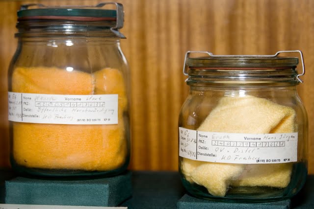 Para tener localizados a todos los disidentes, o como mínimo sospechosos, la Stasi recolectó su ropa interior, normalmente robándola de los propios domicilios. Así, si el disidente en cuestión se escabullía de la vigilancia, podía rastrearse su paradero dándoles a los perros las prendas para que pudiesen seguir su olor. Supongo que el hecho de elegir la ropa interior sería por la intensidad del olor y que las sustracciones de prendas se harían directamente del cesto de la ropa sucia. Algunos de los frascos están ahora en exhibición en el museo de la Stasi en Berlín.