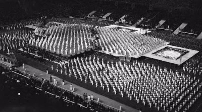 En 1955, el papa Pío XII decidió darle contenido religioso al 1 de mayo estableciendo la Fiesta de San José Obrero, el patrón de los trabajadores, y Franco supo aprovechar aquel regalo para mantener ocupados a los productores y desvirtuar o diluir los actos convocados por los asociaciones clandestinas. Al dotar aquella fiesta del carácter religioso, se celebraban misas por todo el país en honor al santo patrón de los trabajadores y se organizaron espectáculos de bailes regionales y exhibiciones de gimnasia multitudinarias en las que debían participar los productores. A excepción de los actos celebrados en el Camp Nou en 1960, ya que Franco estaba de viaje en Cataluña, desde 1956 hasta 1975 tuvieron lugar en el Santiago Bernabéu.