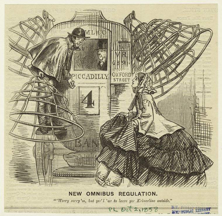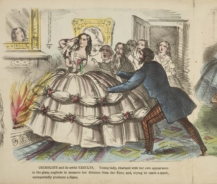 Atravesar las puertas (se modificó la arquitectura de las nuevas viviendas para adaptarlas a las crinolinas), sentarse en las sillas, subir a los carruajes… todo en el día a día era complicado con aquel artilugio y, en ocasiones, mortal. El mayor peligro de las crinolinas radicaba en el alto riesgo de incendio en una época en la que el fuego estaba muy presente en las chimeneas, las cocinas y en la iluminación. Era harto difícil moverse con las crinolinas teniendo que estar pendiente de un perímetro tan grande, por lo que era muy fácil que sin querer se acercasen a algún fuego y que prendiese la falda. De hecho, el New York Times publicó en 1858 en anuncio que advertía del peligro de estas prendas: provocaban una media de tres muertes a la semana.
