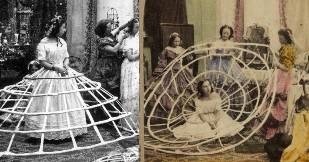 En los comienzos fue fácil conseguir esas faldas acampanadas rellenándolas con enaguas almidonadas. Dos o tres para empezar, y de esta forma eran llevaderas y soportables, pero a medida que las mujeres parecían competir por la falda más ancha se fueron añadiendo enaguas… hasta 14. Para ahorrar peso y aliviar el sofocante calor de tantas prendas, se hicieron intentos para hacer más grandes las faldas sin añadir enaguas. Por ejemplo, poniendo llantas de bicicleta alrededor que se hinchaban con aire o agua (esta última opción podía ser muy embarazosa si se producía una pérdida). Hasta que a mediados del XIX en París apareció la crinolina, un armazón tipo jaula que sustituía a todos las enaguas hecho con crin de caballo y lino («crinis» y «linum«, de ahí su nombre).