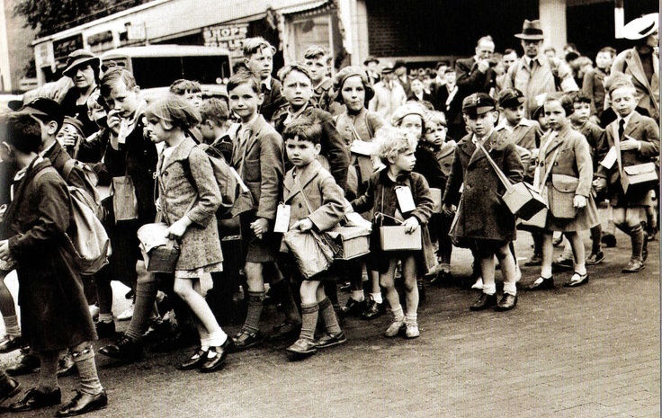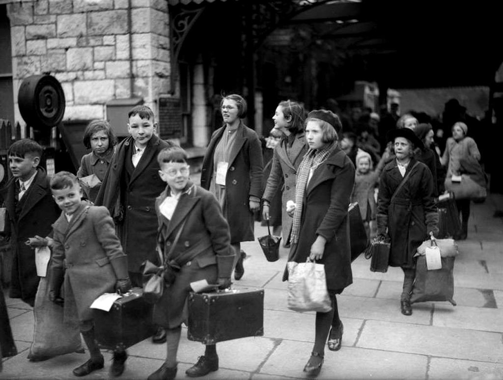 Desde 1939 y hasta el final de la guerra, mujeres ancianas, discapacitadas y embarazadas, pero sobre todo niños en edad escolar -unos tres millones- fueron evacuados de los centros urbanos del Reino Unido a zonas rurales donde el riesgo de bombardeos era mucho menor o inexistente, e incluso a otros países como Canadá, Sudáfrica, Australia, Nueva Zelanda o Estados Unidos. Se reunía a los niños en los colegios y eran distribuidos en grupos de 10 que quedaban a cargo de un funcionario o un profesor. Todos llevaban una etiqueta identificativa con sus datos y una bolsa o pequeña maleta con sus efectos personales.