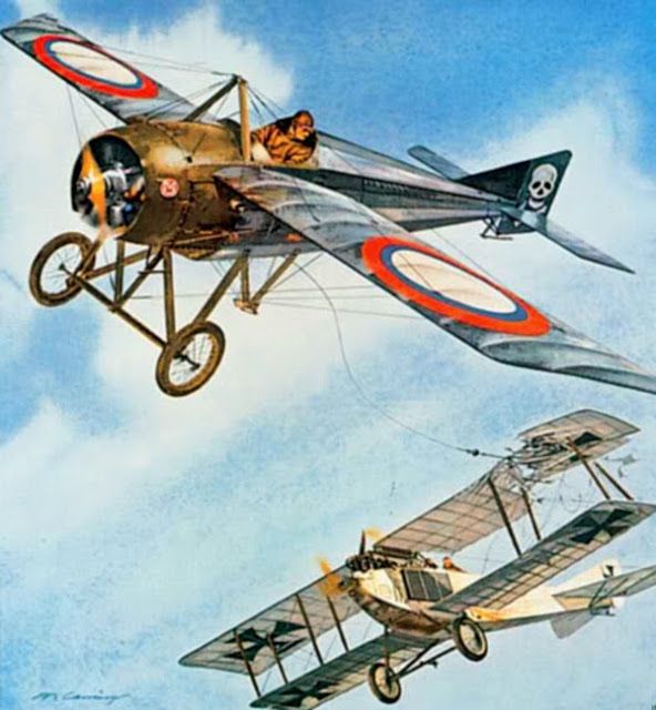 No se donde leí que en esa guerra los ataques desde el aire eran escasos y con muchos menos aviones de lo que las peliculas y juegos nos han mostrado, sin paracaidas y los pilotos eran considerados caballeros del aire, siendo algunos de renombre y prestigio.