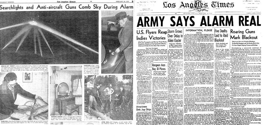 El 23 de febrero de 1942 el submarino I-17 de la Marina imperial japonesa, que había participado en el ataque a Pearl Harbor, bombardeaba la costa americana causando daños en una refinería de petróleo en Santa Mónica (California). Antes de que el ejército pudiese reaccionar, el submarino se sumergió y desapareció. Los japoneses habían atacado en suelo americano. Las muestras de pánico se sucedían y el temor a un ataque aéreo, como en Pearl Harbor, se extendió entre la población. Pero nada más ocurrió… aquel día. A las tres horas y quince minutos de la madrugada del 24 al 25 de febrero, y con el miedo en el cuerpo, las sirenas de alarma sonaron en Los Ángeles y el ejército, ante el posible ataque aéreo de los japoneses, ordenó un apagón general. Las baterías antiaéreas americanas dispararon más de mil cuatrocientos proyectiles durante una hora a los aviones enemigos. Tras horas de tensa calma, a las siete y veintiún minutos se volvió a conectar la luz. El resultado final de la llamada batalla de Los Ángeles fue seis estadounidenses muertos… por daños colaterales de fuego amigo (tres por cascotes de edificios dañados y otros tres por infartos).