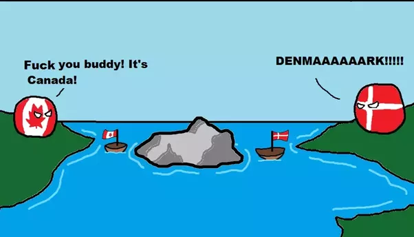 En los años 30, la Liga de las Naciones (predecesora de las Naciones Unidas) estableció que la Isla Hans pertenecía a los daneses. Pero los canadienses alegan que, al desaparecer esta institución, la decisión queda invalidada y, de momento, las Naciones Unidas no se han mojado. Durante los años 70, ambos gobiernos pactaron una lista de 127 puntos geográficos que delimitaban la frontera marítima entre los dos países en el estrecho de Nares. Pero entre los puntos 122 y 123 decidieron no dibujar ninguna línea y, por tanto, no delimitar la frontera, era la Isla Hans. Pero no penséis que la cosa se queda ahí. La tensión entre ambos países es muy fuerte y, hasta podríamos hablar de uno de los puntos calientes de la geopolítica mundial -modo ironic-. En una muestra de “violencia descontrolada”, cada año se repite un enfrentamiento entre las fuerzas armadas canadienses y danesas. Cada mes de agosto, el ejército canadiense lleva a cabo unas maniobras militares en la zona de la Isla Ellesmere. Cuando pasan cerca de la Isla Hans, desembarcan unos cuantos soldados, retiran la bandera danesa, izan la canadiense y, junto al mástil dejan una botella de whisky canadiense con el mensaje: “Bienvenidos a Canadá“. El ejército danés no se queda atrás en el uso desproporcionado de la fuerza y, cada primavera, envían un destacamento a la Isla Hans que se encarga de descolgar la bandera de Canadá, colocar la danesa, se beben el whisky y depositan una botella de Schnapps con un cartel que dice: “Estáis en territorio de Dinamarca“.