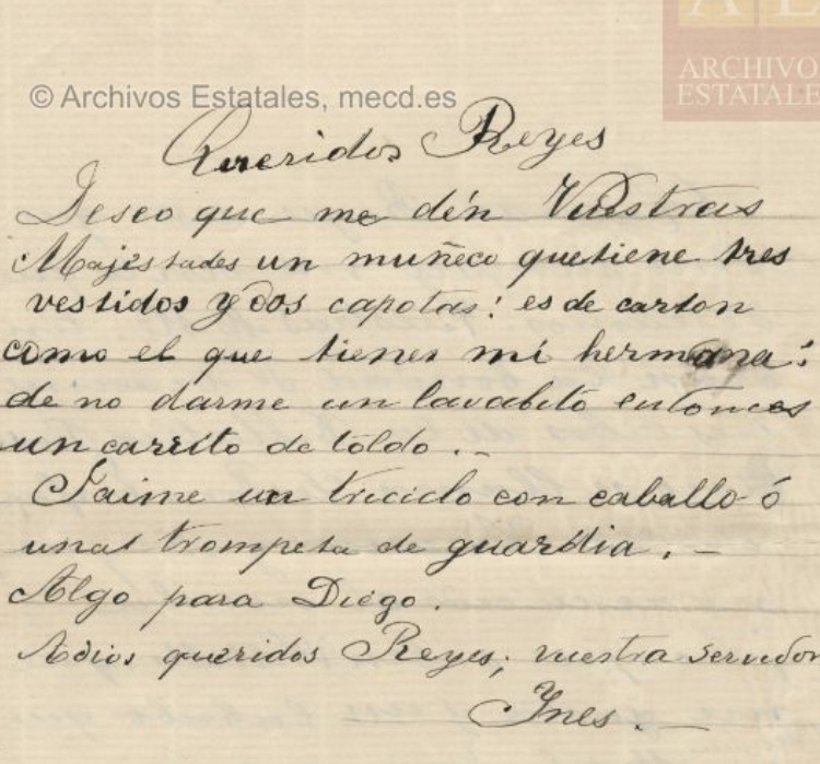 Se trata de un conjunto documental compuesto por tres unidades, a saber: las cartas de Rosario, Inés y Perico, cuya relación e identidad desconocemos por el momento. Rosario se muestra confiada en que, como siempre, los reyes le traerán lo que pide. No sabemos qué edad tiene pero solicita nada menos que tres libros, dos de los cuales están en francés, solicita además algo que hoy nos resulta casi desconcertante “un lavabo” y, para finalizar, tiene la cristiana virtud de pedir una peseta para los pobres; Inés, menos elevada que Rosario, plasma su deseo de tener un muñeco con sus complementos respectivos, también da muestras de su generosidad al pedir una trompeta y un triciclo para Jaime y “algo para Diego”; finalmente está la carta de Perico, un niño que se muestra amedrentado ante la idea de solicitar a su edad (doce años) sus regalos navideños: se conforma con una “cinco pesetas en indemnización” por lo gastado. Y ya está, porque Perico “no se atreve a ser más petidor (sic.)”