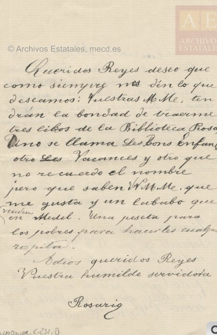 Queridos reyes deseo que como siempre nos den lo que deseamos: Vuestras M.M. tendrán la bondad de traerme tres libros de la Biblioteca Rosa, uno se llama Les Bons Infants, otro les Vacances y otro que no recuerdo el nombre pero que saben V. Sus Majestades , que me gusta y un lavabo que venden en Medel . Una peseta para los pobres para hacerles cualquier ropita.