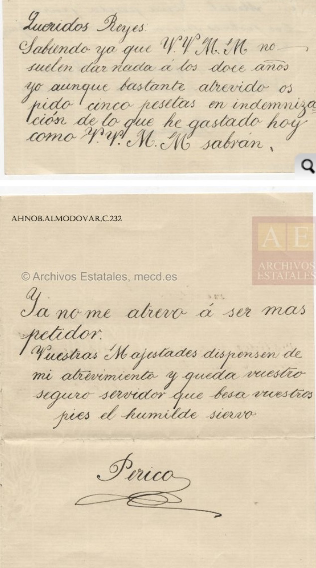 Sabiendo ya que Vuestras Majestades no suele dar nada a los doce años yo aunque bastante atrevido os pido cinco pesetas en indemnización de lo que he gastado hoy como vuestras Majestades sabran.