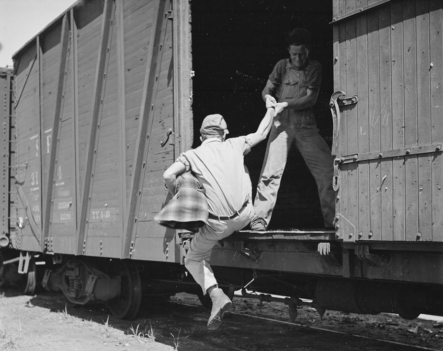 Con un mercado laboral precario, temporal y con poca oferta, a muchas personas no les quedó más remedio que abandonar sus hogares, coger un hatillo y buscar trabajo de lo que fuese y donde fuese. A estos trabajadores nómadas y transitorios se les llamó «hobos«, una especie de vagabundos laborales. Y digo laborales porque no habría que confundirlos con nuestro concepto de vagabundo, un errante que va de un lugar a otro sin asentarse en ninguno y vive de la caridad. Estos vagabundos iban de aquí para allá buscando la oportunidad de ganar unos dólares. Cubiertas sus necesidades, normalmente la comida y poco más, el resto de lo que ganaban era para enviar a sus familias. Lógicamente, la retribución por sus trabajos era escasa, por decir algo, así que debían buscarse la vida para ahorrar, desde colarse en trenes de carga para viajar gratis hasta rapiñar algo de comida en campos o mercadillos, con el riesgo de ser detenidos por la policía o, peor aún, encontrarse con un agricultor con malas pulgas y su escopeta.
