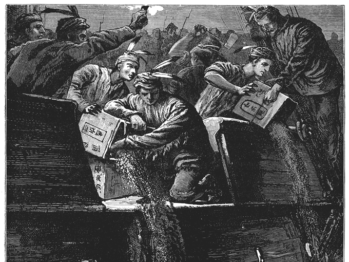 Lógicamente, la encargada del comercio del té era la Compañía Británica de las Indias Orientales, que llegó a generar más ingresos que el propio Estado y a gobernar a muchas más personas. Y sí, el producto estrella era el té, hasta que alrededor de 1770 las cosas se empezaron a torcer por el éxito del té de contrabando que entraba en Inglaterra y en sus colonias. Al no tener que pagar aranceles, era mucho más barato y la Compañía pidió auxilio al gobierno. Los contrabandistas estaban rompiendo el monopolio y echando por el tierra el chiringuito. No hizo falta suplicar mucho, ya que los aranceles que pagaba el té suponían el 10 de los ingresos gubernamentales. En 1773 se promulgó la Ley del Té que permitía a la Compañía llevarlo directamente a las Treces Colonias sin pasar por Inglaterra, lo que equivalía a rebajar el precio y poder competir con el de contrabando, ya que solo tenía que pagar el impuesto de venta en destino pero no el de importación en la metrópoli, que era mayor. Pero no, los colonos americanos dijeron que no estaban por la labor, ellos querían libre comercio y comprar el té, o lo que fuese, a quien quisiesen y no tener que hacerlo, sí o sí, a la Compañía. Todo estalló por los aires en diciembre de ese mismo año, cuando un grupo de colonos, disfrazados de indios, arrojaron al mar el cargamento de té de tres barcos británicos. El llamado «motín del té» fue el germen de la revolución que llevó a la independencia de las Trece Colonias.