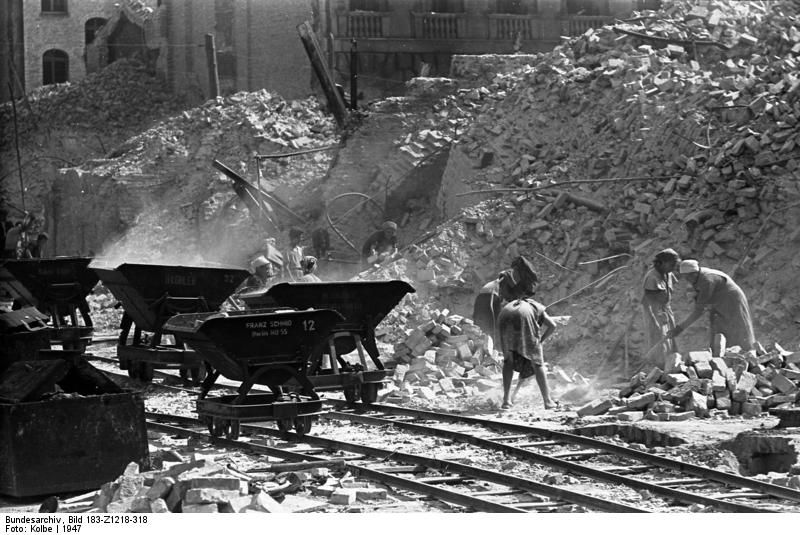 ¿Y quién se hizo cargo de este arduo trabajo? Las llamadas mujeres de los escombros, mujeres de entre 15 y 50 años que, con sus manos, picos, palas y maquinaria rudimentaria, poco más allá de alguna polea, retiraron los escombros y desmontaron los restos de edificios para sacar los ladrillos y todo lo que se pudiese aprovechar y reutilizarlo en reparaciones y nuevas construcciones. Fueron un símbolo de la voluntad de reconstruir y la supervivencia de los alemanes.