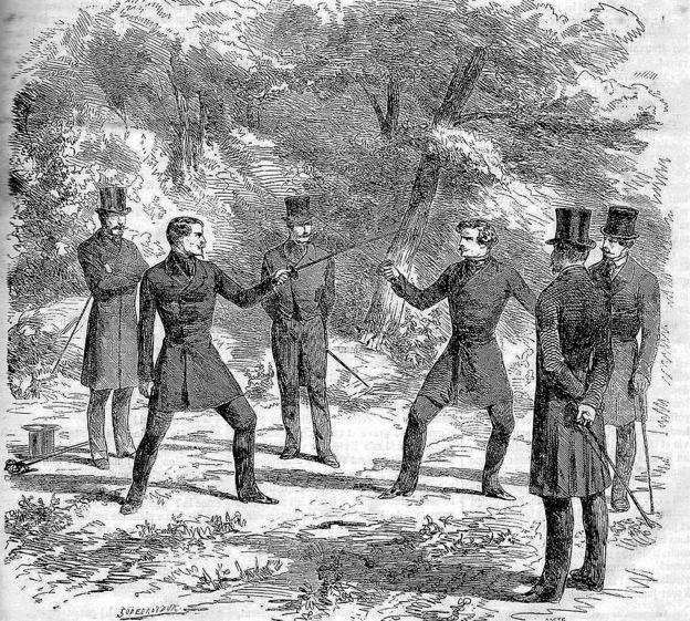 Pero había situaciones más peligrosas. Retar a un periodista a batirse en el campo del honor era como el actual derecho de réplica, pero más personal… ¡y mucho más eficaz! Tantas llegaron a ser las réplicas de los ofendidos que apenas si existía redacción donde no se guardase un juego de pistolas y una pareja de sables. Y era habitual que se habilitase alguna sala de la redacción para que los periodistas recibiesen adiestramiento. También se podían retar a duelo a los críticos de arte. Como el caso del crítico teatral Ignacio Escobar que había puesto a caldo al actor Julián Romea y éste lo retó a duelo. Los dos eran tan malos tiradores que no acertaban; Romea, que como actor no lo sé, pero como duelista era un desastre, apretó el gatillo al tuntún con tan mala fortuna que uno de los padrinos cayó fulminado.