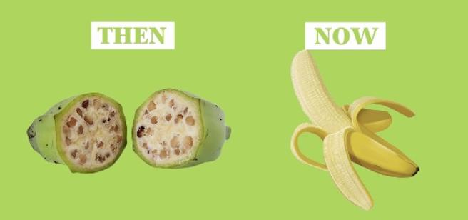Por ejemplo, la banana silvestre se cultivó por primera vez hace 7.000 años en Papúa Nueva Guinea y contenía en su interior una semillas duras y grandes y su color era mucho más verdoso que el de ahora. A día de hoy, los plátanos han sido manipulados genéticamente y el resultado es una fruta con semillas imperceptibles, mejor sabor, más nutrientes y un color mucho más llamativo.