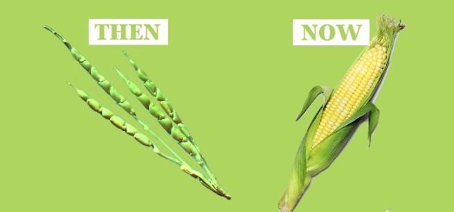 El maíz amarillo y jugoso que podemos encontrar en las fruterías poco tiene que ver con aquella planta verde y seca, de apariencia poco comestible, que se cultivó por primera vez en el año 7.000 a.C. La domesticación del maíz la pusieron en marcha los pobladores de Centroamérica –posiblemente los mayas– a partir del teosinte (es la foto del antes). A Europa ya se trajo la variedad de granos en mazorca y hubo que adaptar su cultivo y su consumo, porque era el responsable de una enfermedad llamada pelagra.