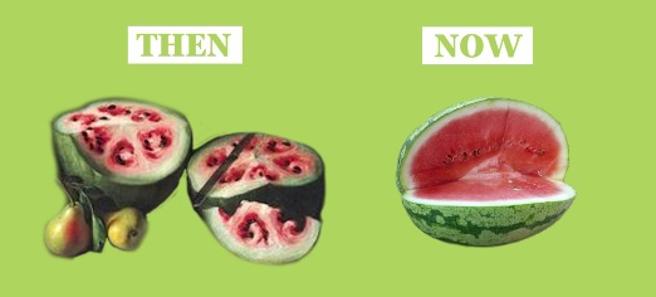 Las sandías, que tienen su origen en África, se convirtieron en un alimento muy común a partir de 1600. El aspecto que tenían entonces era muy distinto de las actuales. Su interior era verde y con unas semillas más grandes. Hoy, las sandías tienen un aspecto mucho más fresco y jugoso, y su interior ha pasado a ser de color rojo.