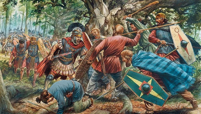 A principios de otoño del 9 d.C., Varo sacó tres legiones de su campamento estival en territorio querusco y las internó en tierras brúcteras en busca de su presunto amigo y aliado Arminio, hasta que llegó a un espeso y estrecho bosque a la altura de la actual ciudad de Osnabrück, en la Baja Sajonia. Arminio, conspirando a sus espaldas, había congregado allí una coalición de tribus germanas dispuestas a preparar una emboscada letal a un iluso legado que movía a la XVII, XVIII y XIX más sus seis cohortes auxiliares con su caballería e impedimenta a través de aquellos sombríos bosques. El pretexto de aquel desplazamiento fue una rebelión inexistente que requería de su intervención. Varo fue avisado de nuevo en varias ocasiones por Segestes y otros caudillos afines a Roma, pero su arrogancia y presunción le hicieron desoír aquellos consejos. Arminio sabía perfectamente cuál era el talón de Aquiles del ejército romano. No tenía ninguna opción de victoria en batalla en campo abierto. Debía de ser una sorpresa en terreno abrupto y blando, como así ocurrió. Fue una auténtica matanza. Durante tres días los germanos aguijonearon la delgada línea romana, partiéndola y acabando poco a poco con cada legión, cohorte o manípulo que quedaba aislada de la fuerza principal. El comandante de la caballería, Numonio, fue el primero en intentar huir y el primero en morir; tras él cayeron otros muchos más, incluido el legado Lucio Egio, que en un alarde de ignorancia intentó rendirse y murió en el intento. El propio Varo resultó herido y, viéndose incapaz de contener aquel desastre y temeroso de acaban en manos germanas, se suicidó. Cerca de 15.000 legionarios más un indeterminado número de auxiliares y civiles (los magos, artesanos, meretrices y demás seguidores del ejército) dejaron su vida y miserias en el bosque de Teutoburgo.