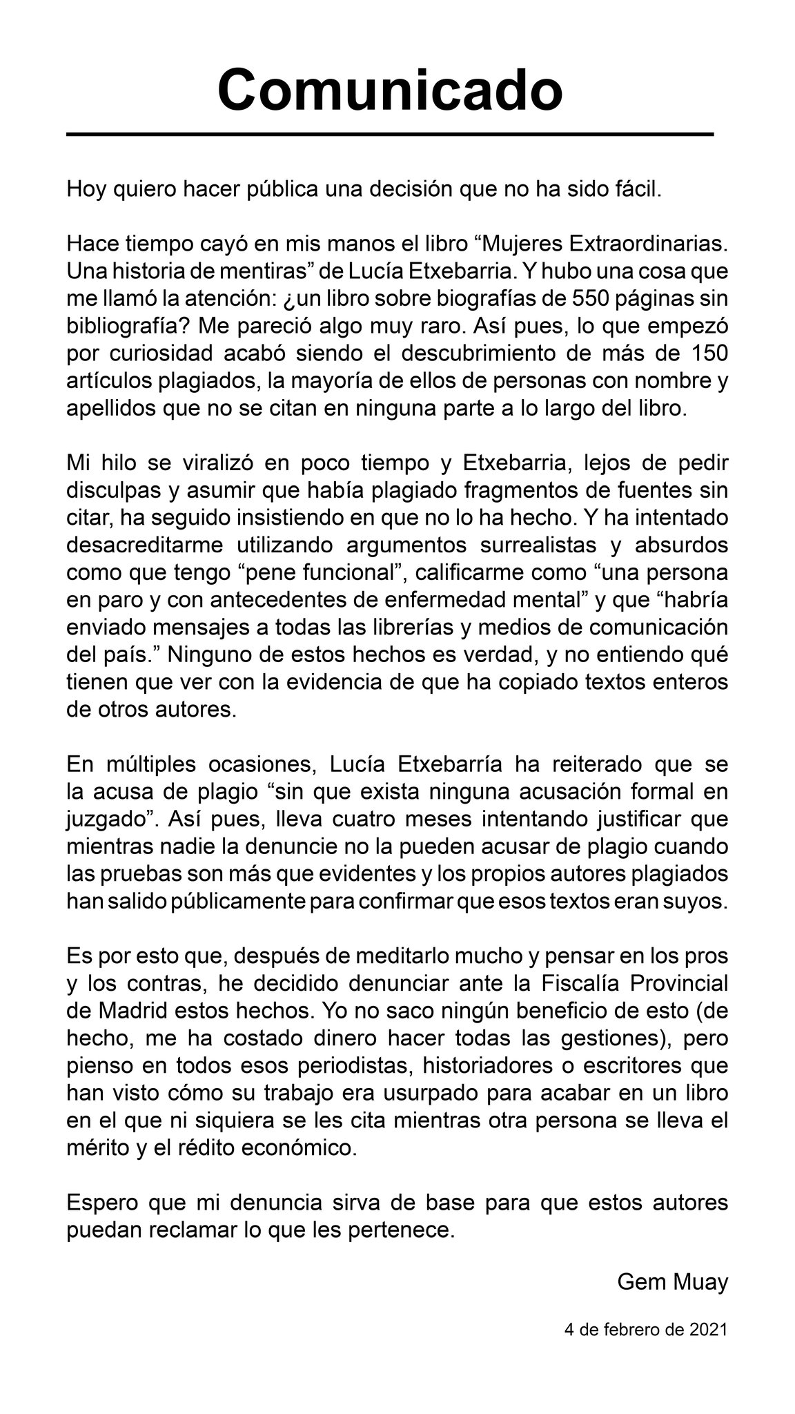 La escritora Lucía Etxebarria ha sido denunciada por presunto delito de plagio en su libro «Mujeres extraordinarias: una historia de mentiras» ante la Fiscalía Provincial de Madrid, según un comunicado que la usuaria Gem Muay ha subido a Twitter.