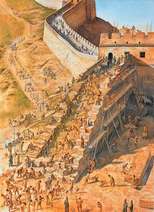 Nos levantamos y fuimos dando un paseo entre animales de carga que transportaban grandes ladrillos desde lo que parecía una fábrica hasta la base de la muralla, obreros que los subían con poleas o que hacían cadenas humanas para llevarlos hasta las zonas más escarpadas, albañiles que los colocaban con una argamasa que cogían de cestas…