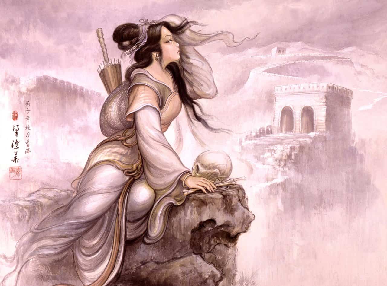 La frase del soldado seguía repitiéndose una y otra vez en mi cabeza… hasta que gracias al tío Google y a que todavía seguía entendiendo el mandarín (apenas duró unas horas), descubrí su significado. Tenía que ver con el cuento «Las lágrimas de Meng Jiangnu«, que forma parte del folclore y la historia de China. Cuenta la leyenda que, en tiempos del emperador Qin Shi Huang, los funcionarios imperiales recorrían los pueblos reclutando obreros para trabajar en la Gran Muralla. Ante la falta de voluntarios, ya que debían abandonar sus tierras y a sus familias, comenzaron a llevárselos por la fuerza. Y eso hicieron con Fan Xiliang, un joven campesino que acababa de casarse con su amada Meng Jiangnü. Tras un año de angustia, lágrimas y preocupación al no tener noticias de su marido, Meng Jiangnü decidió ir en su busca. Emprendió un largo y arduo camino, y a pesar del hambre, la fatiga y el frío consiguió llegar a la Gran Muralla. A todos los trabajadores que encontraba les preguntaba por su marido, hasta que llegó a la zona donde había trabajado. Allí le contaron que había muerto hacía poco más de un mes como consecuencia del agotamiento y las penosas condiciones de trabajo. Sus restos yacían en la muralla. Meng Jiangnü lloró desconsolada durante tres días, y tan desgarrador fue su llanto que provocó el hundimiento de un tramo de la muralla. Entre los escombros descubrió los restos de Fan Xiliang y Meng Jiangnü pudo ver a su marido una última vez. El emperador, enfurecido por el derrumbe de la muralla, ordenó ejecutarla, hasta que la vio en persona. La hermosura de la joven cautivó al emperador y quiso convertirla en su concubina. Al principio ella se negó, pero después de pensarlo detenidamente aceptó con la condición de que se le diese sepultura a Fan Xiliang y sobre su tumba se construyese un mausoleo. Además, el propio emperador debía asistir al entierro. Una vez cumplidas todas las peticiones y cuando el emperador fue a cobrar su recompensa, Meng Jiangnü se lanzó al mar y despareció para siempre. Cuentan que se reunió con su amado.