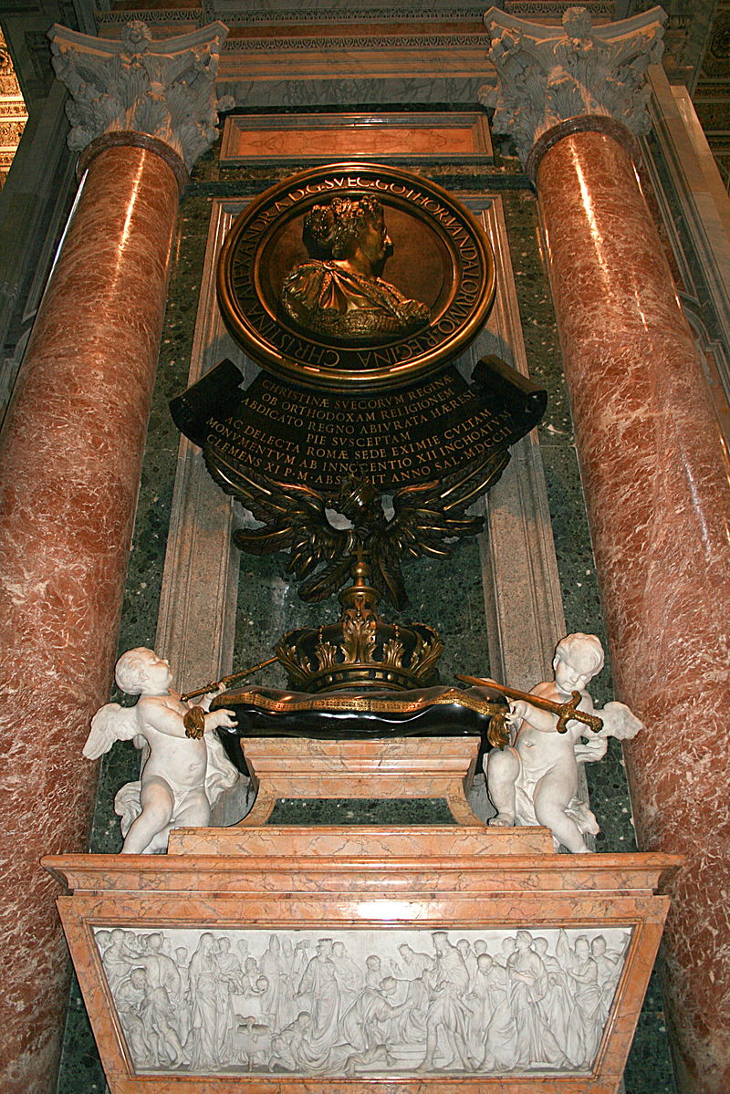 El hecho de que vistiese ropas poco femeninas, que tampoco le gustase ir enjoyada y, sobre todo, que a pesar de la insistencia del parlamento se negase a casarse, fueron argumentos suficientes para que los mentideros de palacio hiciesen correr la voz de que le gustaban más las faldas ajenas que las propias. En 1654, sin encomendarse a dios ni al diablo, la reina comunicó al Consejo su decisión de abdicar y de abandonar el reino. Intentaron convencerla, pero ella, cual don erre que erre, nombró sucesor al trono a su primo Carlos Gustavo y les dijo: “ahí os quedáis, que yo me voy a Flandes”. Y por si no fuera suficiente, soltó una segunda bomba: se convirtió al catolicismo. Cristina demostró ser una mujer íntegra y coherente, ya que sabía que realizar esa conversión siendo la reina de un país protestante habría supuesto otra guerra de religión. Así que, abdicó y se convirtió a titulo privado. Lógicamente, esta conversión hizo mucho pupa en Suecia, abanderada del protestantismo, y en el mundo protestante en general; y, por el contrario, en Roma fue recibida con fanfarrias. De hecho, Alejandro VII ordenó una recepción espectacular cuando hizo su entrada en Roma montando en un caballo blanco y seguida por un gran cortejo.