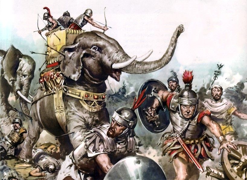 El tiempo de la diplomacia había expirado. Levino contaba con cuatro legiones, cerca de veinte mil infantes auxiliares y mil doscientos jinetes, un ejército muy superior en número al de Pirro. Al amanecer de un cálido día de julio, las tropas romanas cruzaron el río Sinnio y con ello se desató un enfrentamiento durante horas tan igualado como encarnizado. En el fragor del combate, un decurión auxiliar romano localizó a Pirro gracias a su vistoso equipo y penacho y por muy poco no lo abatió, hecho que movió al epirota a ser más prudente y cederle su yelmo y clámide a uno de sus oficiales, Megacles. No erró. Cuando éste fue muerto en combate, el rumor de que Pirro había caído se propagó por todo el ejército y el rey, como acostumbraba hacer, salió al trote a cara descubierta entre sus hombres para que le reconociesen y viesen que era solo un bulo. Fue en aquel momento de efervescencia moral de los suyos cuando decidió utilizar su arma más mortífera e inédita hasta aquel momento: los elefantes de guerra. A día de hoy no podemos describir qué angustia pudieron sentir los legionarios romanos cuando vieron aparecer ante ellos aquellas veinte moles barritando y alzando su trompa, sobre cuyos lomos había castilletes repletos de arqueros. La inmensa mayoría de ellos jamás había visto un paquidermo en toda su vida, y mucho menos equipado de aquella espantosa manera. Ni la infantería, ni la caballería, pudo controlar el pánico y, desoyendo a los oficiales, huyeron todos despavoridos del campo de batalla, llegando a abandonar en su alocada fuga su propio campamento. Algo así suponía en la Antigüedad una derrota absoluta, pues los suministros, esclavos, equipo personal, etc. quedaban a merced de los vencedores.
