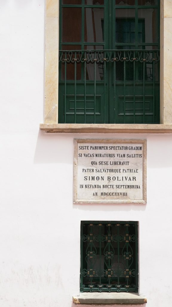 Con Simón Bolívar como presidente de la recién creada Gran Colombia o República de Colombia (formada inicialmente por los actuales territorios de Colombia y Venezuela, a los que luego se unirían Ecuador y Panamá), el movimiento emancipador continuó luchando para liberar otros territorios y conformar el ideal bolivariano: una unidad territorial y política constituida por los territorios ocupados por el imperio español en todo el continente. Manuela abandona Quito junto al Libertador y se dirigen a Perú, donde tendrá lugar la batalla de Ayacucho (1824), el último gran enfrentamiento entre las fuerzas independentistas y las españolas. La derrota del contingente militar realista más importante que quedaba en el continente, conlleva la independencia del Perú. La Gran Colombia bolivariana estaba más cerca… ¿o no? Las disputas territoriales entre la Gran Colombia y Perú, así como movimientos independentistas dentro la propia Gran Colombia, precisan que Bolívar viaje aquí y allá para tratar de mantener en pie aquel coloso con pies de barro. Manuela se queda en Lima y se entera, gracias a un red de espías que ha puesto en marcha, de que los antibolivarianos han organizado una manifestación. Y vaya con la barragana [modo ironía], porque fue capaz, ella sola, de planificar y organizar una contramanifestación con soldados y simpatizantes que acalló a los opositores de Bolívar. Un año más tarde, en septiembre de 1828, Manuela y Bolívar vuelven a reunirse en Bogotá, donde tendrá lugar el episodio en el que se ganará el apelativo de “Libertadora del Libertador”. La relación de Manuela con el general Francisco de Paula Santander, vicepresidente de la Gran Colombia, era la de juntos por obligación pero no revueltos. La una no se fiaba de las intenciones del otro, y el otro no podía soportar que Bolívar hubiese nombrado miembro del Estado Mayor del Ejército Libertador a la otra. Así que, ordenó vigilar a Santander, y descubrió el pastel: una conjura para asesinar a su amado. Avisó a Bolívar, pero ya era tarde. Los 12 conjurados estaban a las puertas de su casa. Aunque Bolívar quiso hacerles frente, eran demasiados. Manuela lo encerró en una habitación y le dijo que ella los entretendría para que pudiese huir por la ventana. Y así lo hicieron. Manuela, jugándose la vida, consiguió un tiempo precioso que permitió huir al Libertador. Todos los conspiradores fueron apresados y ejecutados. Bueno, todos no. Al general Santander, el instigador, se le conmutó la pena de muerte por el exilio. Una placa en el Palacio de San Carlos de Bogotá recuerda aquel hecho…