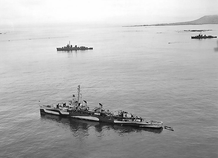 Los problemas comenzaron incluso antes de que el destructor abandonase el muelle para reunirse con el resto del convoy. Y es que a alguien se le olvidó izar completamente el ancla, de manera que cuando comenzó a maniobrar marcha atrás se quedó enganchada en un buque mercante atracado en paralelo junto a él, desgarrando parte de su casco y arrancándole barandas y botes salvavidas. El capitán de nuestro barco, Wilfred Walter, miró su reloj y se dio cuenta de que se le hacía tarde para reunirse con el USS Iowa, así que dirigió al buque mercante una disculpa rápida y se fue a toda máquina de aquel puerto. Podemos imaginar la cara de aquellos novatos marineros mientras recordaban atónitos lo que había sucedido en su primer día de trabajo: