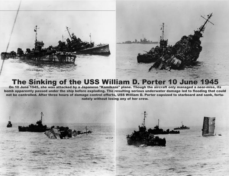 Una vez en el Frente del Pacífico, y a pesar de los esfuerzos del comandante Charles M. Keyes, que relevó al desafortunado capitán Walter en la dirección de la nave, la reputación de nuestro destructor no mejoró. Al contrario, se hundió todavía más cuando acribilló accidentalmente al destructor USS Luce durante los primeros momentos de la batalla de Okinawa. Tras este nuevo incidente el Porter sirvió como apoyo para las tropas que trataban de conquistar aquella isla; utilizó correctamente sus defensas antisubmarinas y hasta llegó a derribar cinco aviones japoneses. Lamentablemente, poco después se informó que también había derribado por error tres aviones norteamericanos. Y así llegamos al final de esta historia. El 10 de junio de 1945 el Porter fue atacado por un avión kamikaze. Nuestro barco se defendió y el avión japonés fue alcanzado y derribado por las defensas antiaéreas, estrellándose en el océano pero sin explotar. La tripulación estaba eufórica: parecía que las cosas cambiaban a mejor. Pero no se habían dado cuenta que el avión kamikaze extrañamente había continuado bajo el agua su trayectoria en dirección hacia el destructor, y justo cuando pasó por debajo de su quilla explotó. Tres horas más tarde el USS William D. Porter se hundía para siempre en el océano.