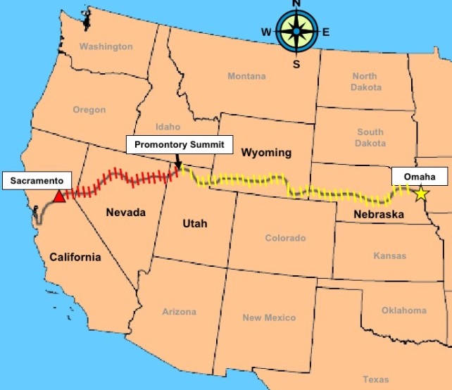 El presidente Abraham Lincoln pudo ver más allá de las necesidades de un país en guerra (estaban en plena Guerra de Secesión) y plantear proyectos de futuro, así que el 1 de julio de 1862 firmó la Ley de Ferrocarriles del Pacífico, comprometiendo recursos federales para el ambicioso plan de construir una línea ferroviaria continua desde el Atlántico hasta el Pacífico. La contrata se concedió a dos empresas: la Union Pacific, que comenzaría en Omaha (Nebraska) e iría hacia el oeste, y a la Central Pacific, que construiría desde Sacramento (California) hacia el este. Una loca carrera por conseguir el mayor número de kilómetros de vía férrea por las dos compañías implicadas en su construcción. El resultado fue que la Central Pacific, partiendo desde Sacramento en enero de 1863, construyó 1.110 kms de vías, atravesando California y Nevada; mientras que la Union Pacific, lo hacía desde Omaha en diciembre de 1865, y construyó 1.749 kms, atravesando el río Missouri, y pasando por Nebraska, Colorado y Utah.