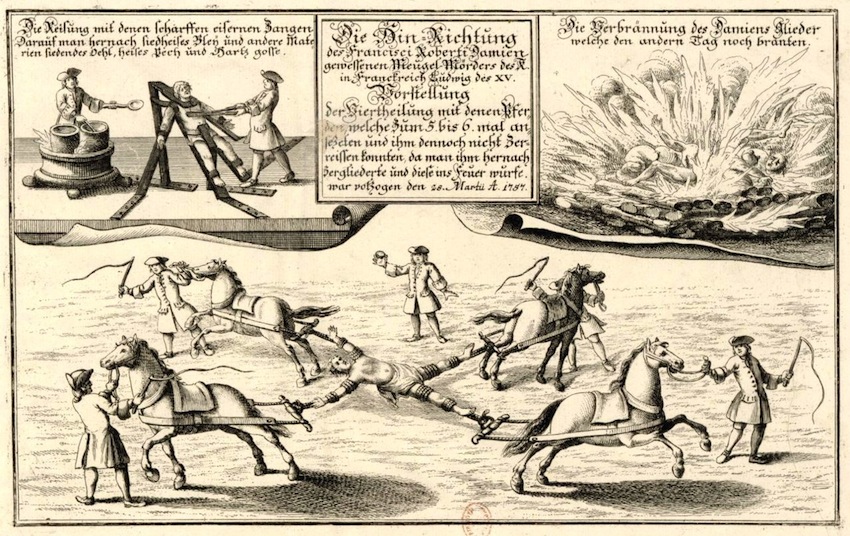 Tuvimos el valor de presenciar la espantosa visión durante cuatro horas. Damiens era un fanático que, con la idea de hacer una buena obra y obtener la recompensa celestial, había tratado de asesinar a Luis XV; y aunque el intento fue un fracaso, y solo produjo en el rey una leve herida, fue arrancado en pedazos como si el crimen hubiera sido consumado. […] En varias ocasiones me vi obligado a apartar la cara y taparme los oídos mientras oía sus desgarradores alaridos, después de que la mitad de su cuerpo se hubiese separado de él […].