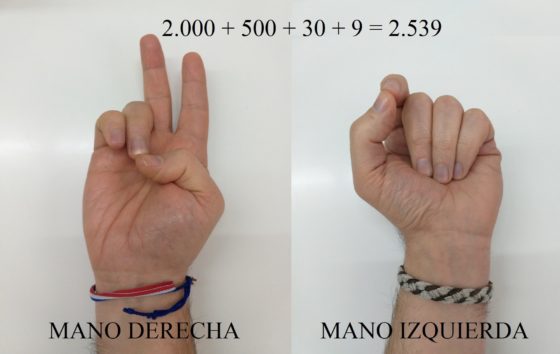 El número 2.539. Con la mano derecha se representa 2.000 con los dedos meñique, anular y corazón y 500 con el índice y el pulgar, mientras que con la mano izquierda se representa 30 con el índice y el pulgar, y con los otros tres, 9