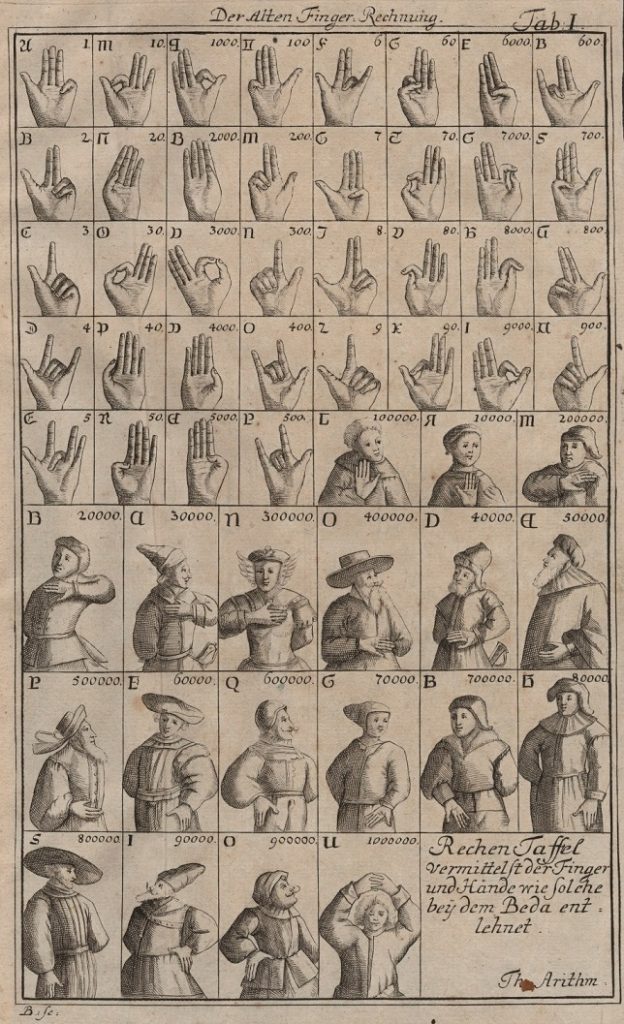 Me atrevería a decir, y creo no equivocarme, que el cómputo con los dedos es seguramente el modo de contar más antiguo de la historia, y aunque fue mencionado por los clásicos no ha sobrevivido ningún tratado de la Antigüedad sobre el tema, por lo que parece que la técnica se transmitió principalmente a través de la tradición oral… o viendo cómo lo hacían los animales. Tenemos referencias a este método de contar en la comedia El saldado fanfarrón de Plauto («su derecha calcula con los dedos«); en la Sátira X de Juvenal («cuenta sus años con los dedos de la mano derecha«); Plinio, en su Historia Natural, cuenta que una estatua de Jano, atribuida a la época del rey Numa, tenía las manos en la posición de tal forma que representaban el número 365 (días) -recordemos que Jano era el dios del tiempo, las transiciones, los comienzos y los finales, y que en su honor tenemos Ianuarius (enero)-; Quintiliano hace mención también de esta tradición y señala que el conocimiento de los números no es sólo indispensable para el orador e indica que un abogado que muestra torpeza contando con los dedos da una pésima imagen de sí mismo. Si os habéis dado cuenta, ya no solo hablamos de contar los dedos, sino también de cómo se representaban los números con los dedos. Y para ello tenemos que recurrir a Beda el Venerable, un monje benedictino de Northumbria (Gran Bretaña).
