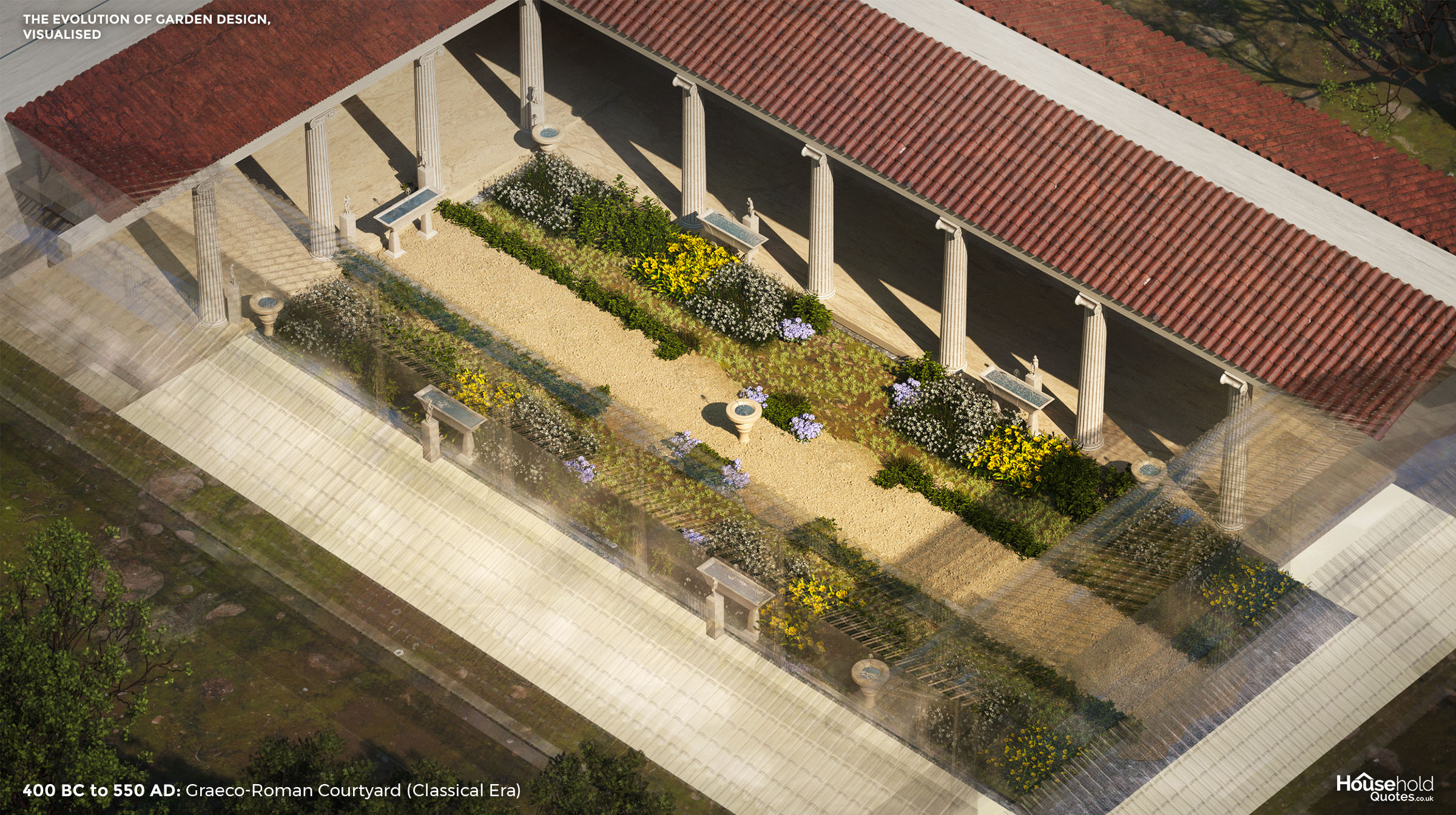 Solo los ricos tenían espacio para un pequeño patio/jardín en el centro de sus casa. Los altos muros brindaban privacidad y regulaban el clima para uso durante todo el año y el pórtico techado alrededor (peristilo) ofrecía refugio del calor y la lluvia. La presencia de estas columnas indica que ya no eran esos primeros jardines en versión huertos urbanos, sino lugares diseñados para el entretenimiento y el ocio, donde los colores y fragancias de rosas, violetas, azafrán, tomillo, caléndulas y narcisos se entremezclaban con las fuentes y estatuas.