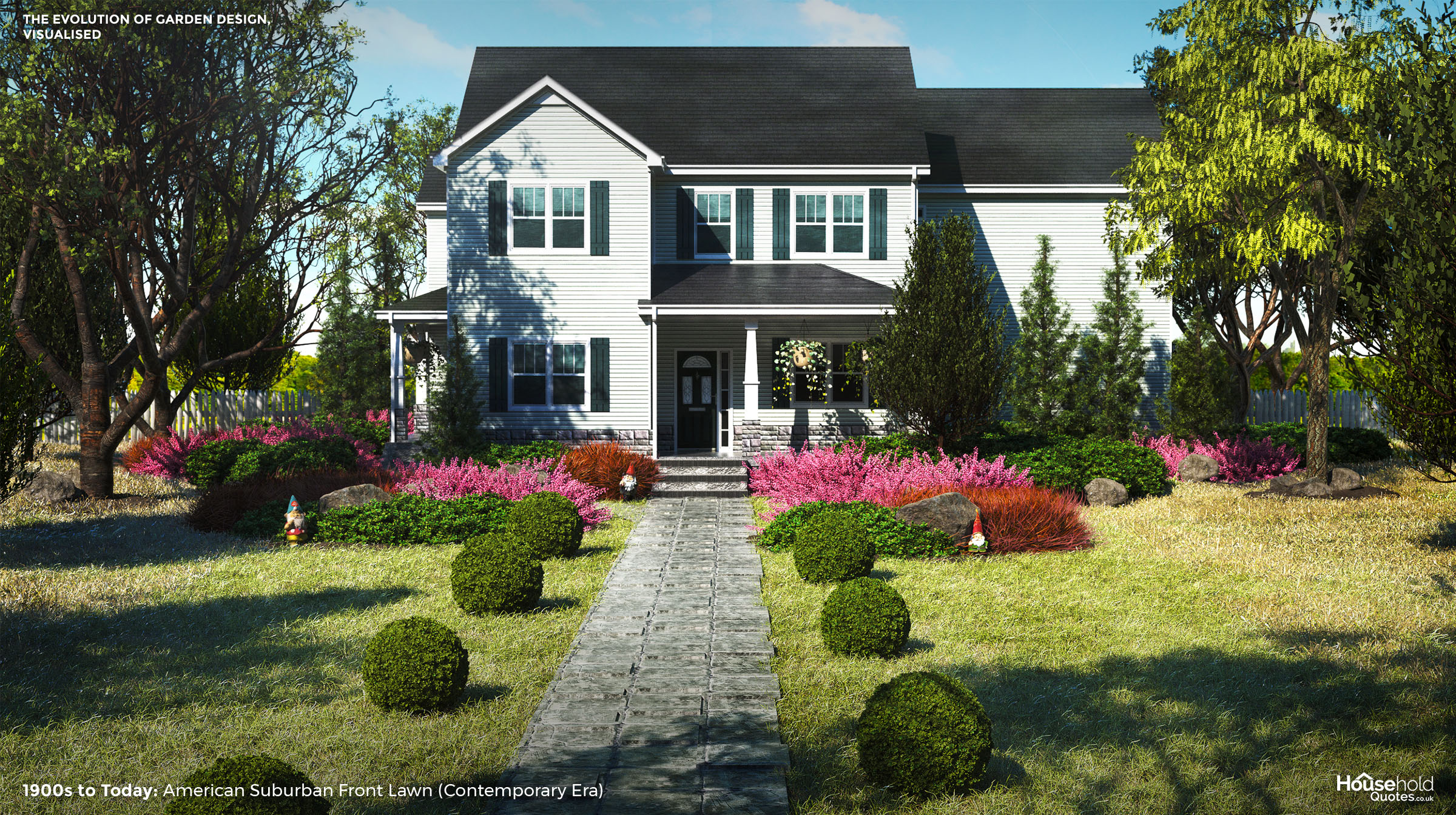 Es un clásico moderno: el jardín con césped en la parte delantera de la casa como símbolo del logro de la clase media (estadounidense). Dejando a un lado el mantenimiento del césped, el arte del jardín delantero se encuentra en sus elementos prácticos: un camino que ofrece diferentes vistas de la casa y el paisaje circundante, esa valla blanca y un árbol que da sombra (y unos enanitos).