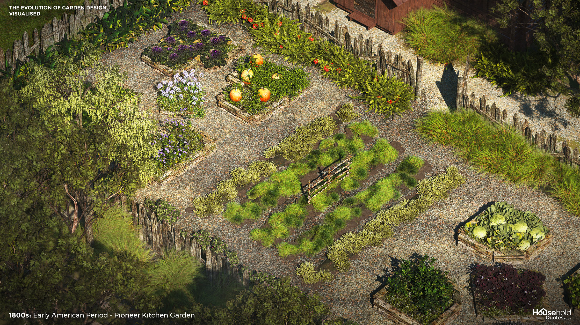 La estética era lo último en lo que pensaban estos jardineros/pioneros, ya que la huerta era una fuente vital de alimentos (sobre todo maíz, frijoles y calabazas). El jardín se diseñó pensando en la eficiencia: cerca de la puerta para el acceso y la seguridad, con caminos perimetrales para cosechar en lugar de admirar y setos o cercas alrededor para mantener alejadas a las alimañas.