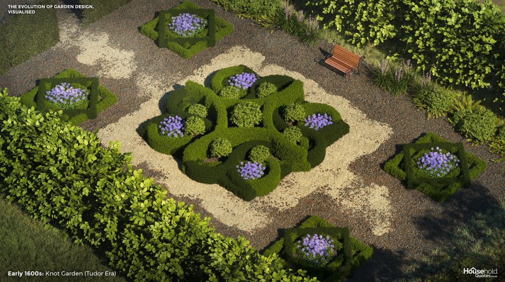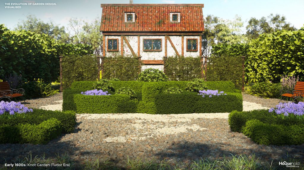 Los diseñadores Tudor tejieron influencias medievales y renacentistas de Italia en jardines impresionantemente complejos. El jardín de setos había comenzado en la época medieval como una forma práctica de dividir los huertos familiares con patrones entrelazados de hierbas. Bajo Enrique VIII y, más tarde, Isabel I, el seto se convirtió en un elemento ornamental. Los jardines Tudor podían ser grandes atracciones, incluidos laberintos y estanques de peces.