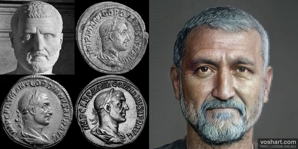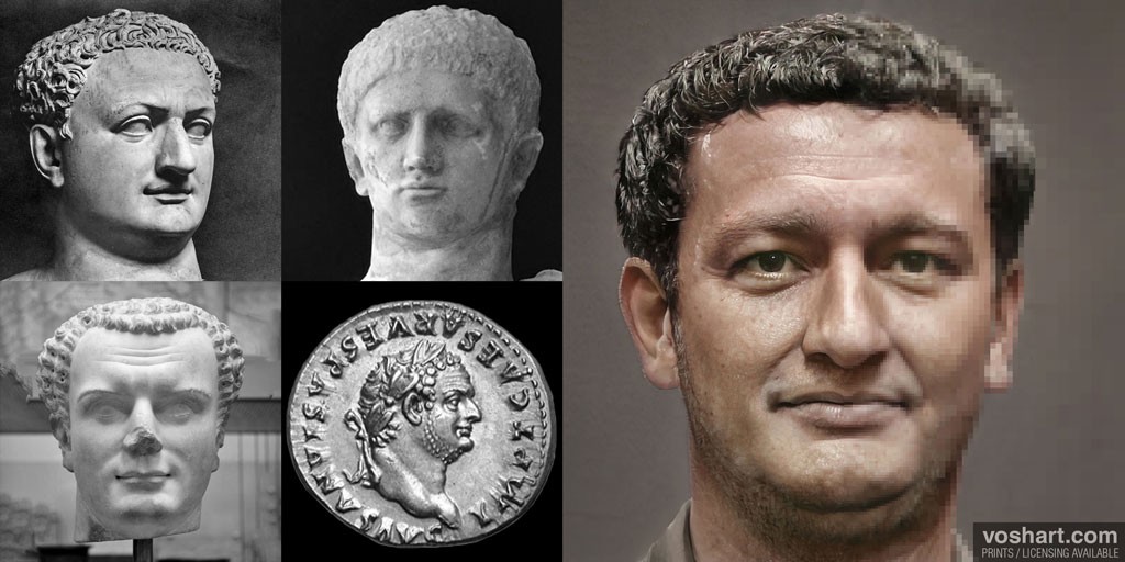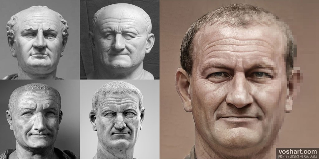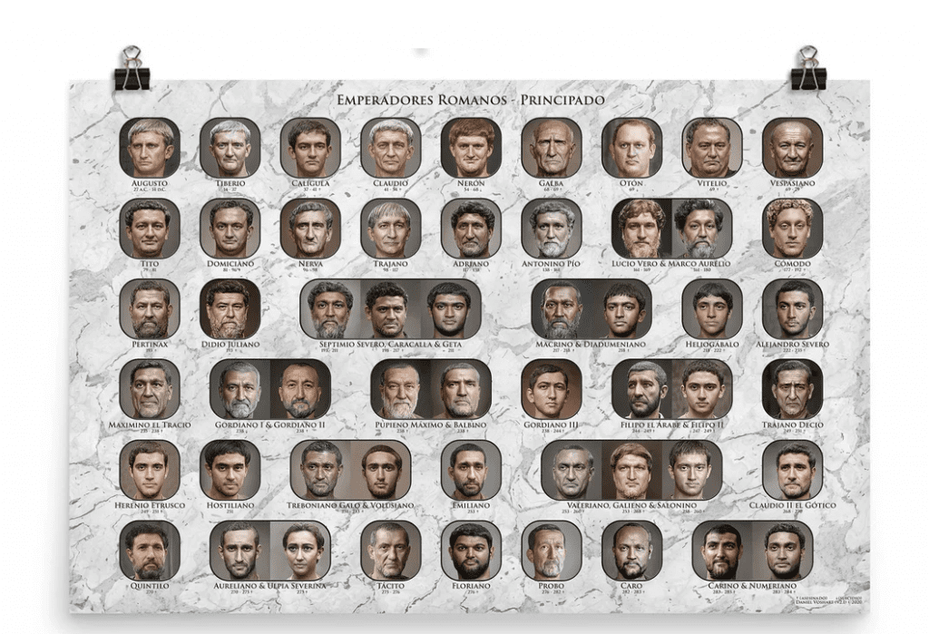 A muchos de nosotros nos habría gustado, por diferentes motivos y razones, tener un «cara a cara» con alguno de los emperadores de Roma, cuestión harto difícil a fecha de hoy. Así que, no nos queda otro remedio que «devolverlos a la vida» tirando de la inteligencia artificial, Photoshop, referencias históricas y la mano del diseñador canadiense Daniel Voshart. Para llevar a cabo el proyecto, Voshart ha utilizado 800 imágenes de bustos y monedas para conseguir el rostro de los 54 emperadores romanos de la etapa del Principado (que se extiende desde el 27 a.C. hasta el 285). El diseñador explica que su objetivo no es romantizar ni hacer parecer heroicos a los emperadores, sino mostrar su apariencia aproximada cuando estaban vivos, asumiendo que los artistas de la época tendían a embellecer las facciones de quien pagaba y ordenaba.