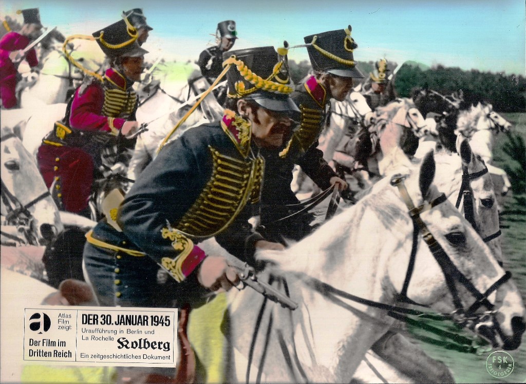 Durante las Guerras napoleónicas, la confrontación del pueblo contra el ejército francés y el propio Napoleón, así como la lucha contra las diversas ocupaciones de éste en muchos territorios, se convirtieron en la semilla de numerosos nacionalismos a lo largo y ancho de Europa. Por lo que no es de extrañar que, en ciertas ocasiones, se recurra al cine ambientado en esta época para mostrar momentos de resistencia frente al opresor napoleónico, con el fin de hacer renacer un sentimiento que se había perdido… en este contexto se enmarca la película Kolberg. En ella, se narra la ferviente resistencia del pueblo alemán de Kolberg frente al ejército francés. Opiniones artísticas aparte, la principal intención de esta película es la de transmitir al público un mensaje directamente relacionado con la situación del país, ya que Goebbels pretendía levantar el ánimo del pueblo alemán con la intención de resistir una vez más al invasor extranjero. Es interesante ver como se recoge un hecho histórico y se adapta para que transmita el mensaje apropiado. Sin ir más lejos, los sucesos acontecidos en 1806 fueron ligeramente maquillados; por ejemplo, al final de la película los habitantes de Kolberg logran que el enemigo levante el asedio, sin embargo, los franceses llegaron a entrar en el pueblo, y solo se retiraron cuando el rey de Prusia firmó el armisticio con Napoleón.