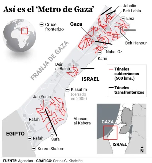El suelo arenoso de Gaza es el peor enemigo de Israel. Ha podido excavarse casi con las manos, lejos de miradas indiscretas desde hace más de tres lustros, para horadar una de las mayores mallas de túneles y pasadizos del planeta en uno de los territorios más minúsculos. El Estado Mayor de las Fuerzas Armadas de Israel ha bautizado como el metro de Gaza a la estratégica red de decenas de kilómetros de galerías de uso militar, considerada como el arma secreta de Hamás frente a una invasión. Al contrario que los túneles de contrabando en la frontera con Egipto (donde todo lo que pasa «tributa» ante Hamas) o los pasadizos de ataque excavados bajo la divisoria con Israel, esta otra red de túneles (Hamás afirma que de unos 500 kilómetros) son utilizados para transportar personas y mercancías, almacenar cohetes y depósitos de munición y albergar centros de mando y control de Hamas (también se teme que los casi 200 rehenes secuestrados estén retenidos bajo tierra), todo ello lejos de las miradas indiscretas de los aviones y drones de vigilancia israelíes.